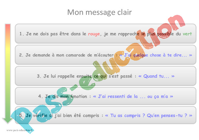 - Que devrait-il dire, quel message clair vais-je formuler pour y parvenir ? (On appelle message clair, le petit message que je vais pouvoir formuler calmement à celui qui est à l’origine de ma colère ou contrariété afin de régler le conflit qui m’oppose à lui).