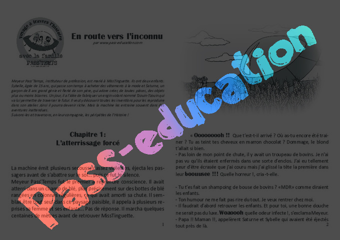 La machine émit plusieurs secousses assez violentes, éjecta les passagers avant de s’abattre sur le sol… puis ce fut le silence.Meyeur Pass’Temps fut le premier à reprendre conscience. Il avait atterri dans un champ de blé, plus précisément sur des bottes de blé rangées en colonnes régulières, ce qui avait amorti sa chute. Il semblait être tout seul dans ce paysage paisible, il appela à plusieurs reprises sa femme et ses enfants… Pas de réponse. Il marcha quelques centaines de mètres avant de retrouver MissTinguette.