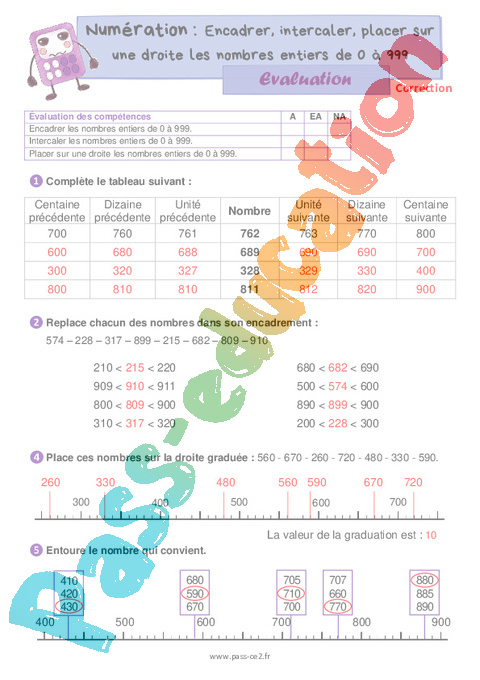 Évaluation de numération pour la Primaire 3 sur encadrer, intercaler et placer sur une droite numérique les nombres de 0 à 999.