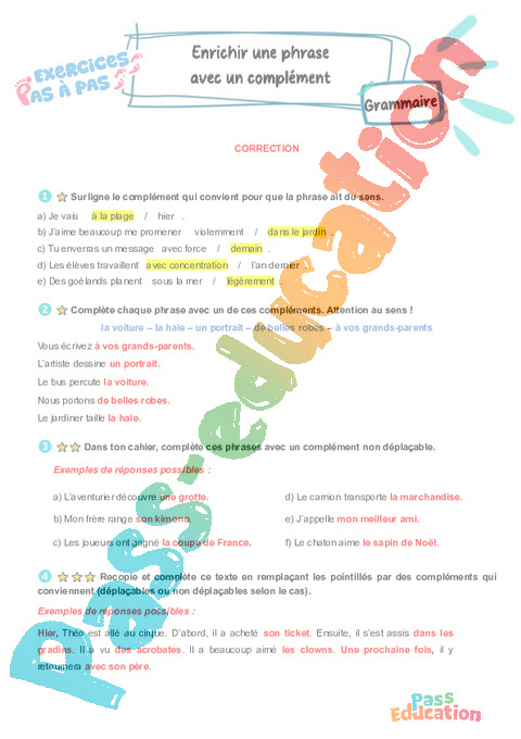 Correction Enrichir une phrase avec un complément : Primaire 3 – Mémo + Exercices Pas à Pas rtf