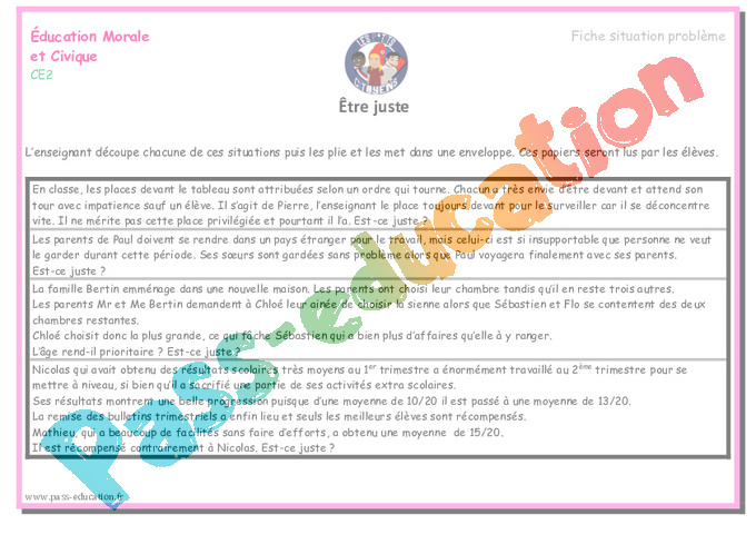 Être juste : Primaire 3 – EMC -Fiche situation problème pdf