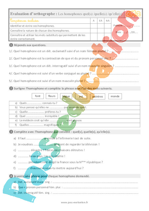 Evaluation : Primaire 5 – Les homophones(s) quel(s) quelle(s)qu’elle(s) pdf