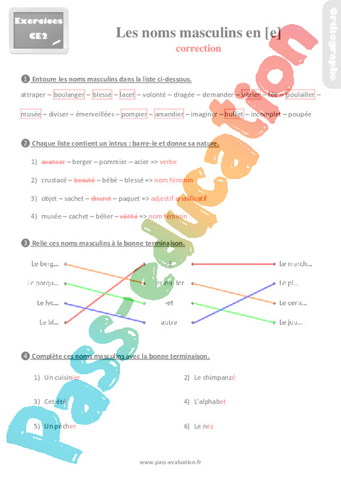 Exercices : Primaire 3 sur les noms masculins en [e]-Correction pdf