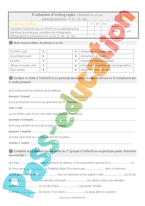 Evaluation : Primaire 4 Infinitif en -er ou participe passé en -é -ée – és -ées pdf