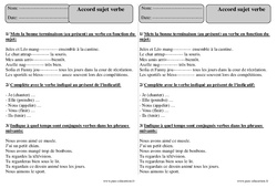 : Primaire 3 – Exercices de grammaire à imprimer: Accord sujet verbe 1/ Mets la bonne terminaison (au présent) au verbe en fonction du sujet: 2/ Complète avec le verbe indiqué au présent de l’indicatif: 3/ Indique à quel temps sont conjugués verbes dans les phrases suivants: Voir les fiches