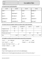 Mathématiques- Exercices sur les mesures en Primaire 5 : Unités d’aire 1/ Convertis des mesures d’aires: 2/ Effectue les conversions: 3/ Écris l’unité d’aire qui convient: 4/ Complète: 5/ Problèmes: 2ème série d’exercices 1/ Convertis des mesures d’aires: 2/ Effectue les conversions ci-dessous: 3/ Recopie et complète ces égalités: Voir les fiches