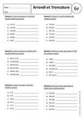 Arrondi – Troncature – Exercices corrigés : Primaire 6 – Nombres décimaux Exercice 1 : Faire la troncature des nombres décimaux suivants 34,123 : ….. 143,531 : ….. 543,390 : ….. 438,99 : ….. 348,38 : ….. 438,5 : ….. Exercice 2 : Faire la troncature des nombres décimaux suivants 438 123,124 : ….. 142 309,548 : ….. 548 549,102 : ….. 438 154,994 : ….. 348 491,582 : ….. 184 358, 190 : ….. Exercice 3 : Donner l’arrondi…