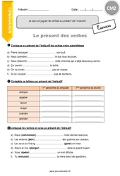 Exercices à imprimer : Primaire 5 : Je sais conjuguer les verbes au présent de l’indicatif (révision) Consignes pour ces exercices : Conjugue au présent de l’indicatif les verbes entre parenthèses Complète ce tableau au présent de l’indicatif Conjugue au présent de l’indicatif les verbes entre parenthèses Pierre (essayer) ….. son pull. Nous (prendre) ….. le bus tous les jours. Nous (blanchir) ….. cette chemise qui a déjà beaucoup servie. Ça (sentir) ….. le brûlé. On ne (crier) ….. pas…