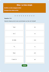 Cet exercice en ligne de conjugaison en Français s’adresse aux élèves de : Primaire 4 () et porte sur le futur de l’indicatif des verbes du 1er et du 2e groupe. Les activités proposées permettent d’identifier les formes verbales au futur, d’associer pronoms et terminaisons, puis d’appliquer correctement les règles de conjugaison dans des phrases variées. L’entraînement favorise une compréhension progressive du temps du futur, développe l’autonomie et consolide les acquis essentiels pour écrire et s’exprimer avec précision, à l’école…