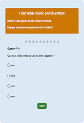 Cet exercice en ligne de conjugaison s’adresse aux élèves de : Primaire 2 pour travailler le futur simple des verbes fréquents vouloir, pouvoir et prendre. À travers des situations proches du quotidien, les élèves apprennent à identifier le temps, à reconnaître les radicaux corrects et à appliquer les terminaisons du futur. Les activités favorisent une compréhension progressive, renforcent l’orthographe verbale et consolident les bases attendues à ce niveau, en classe comme à la maison.Objectifs de l’exercice en ligne autour du…