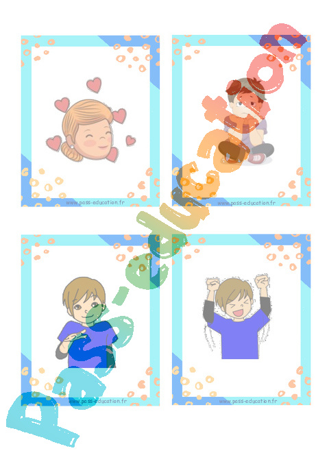 Montrer les flashcards les unes après les autres, à l’ensemble de la classe, tout en prononçant le nom d’une émotion. Si le mot prononcé correspond à l’émotion illustrée, les élèves répètent. Sinon, ils restent silencieux.