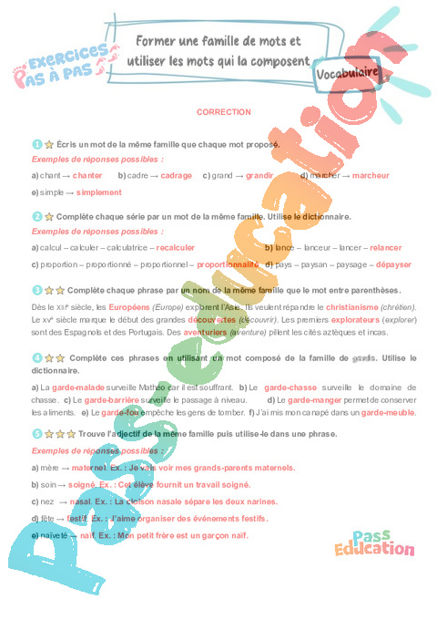 Former une famille de mots et utiliser les mots qui la composent : Primaire 5 – Exercices Pas à Pas rtf