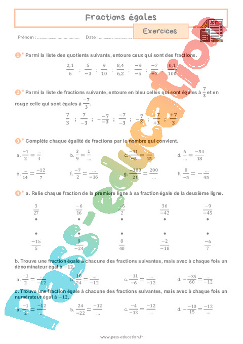 Exercices avec les corrigés pour la Secondaire 2 sur les fractions égales.