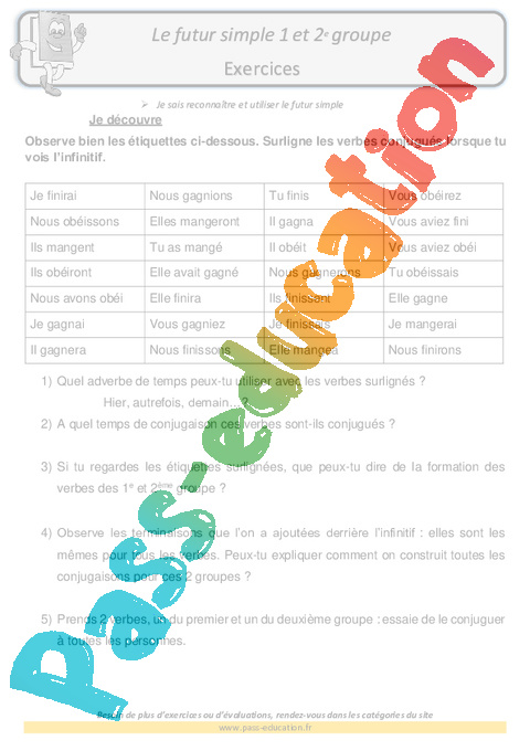 Ce travail permettra à l’enfant de visualiser l’infinitif dans les conjugaisons du 1er et du 2ème groupe au futur et de dégager l’ensemble des terminaisons de la conjugaison.