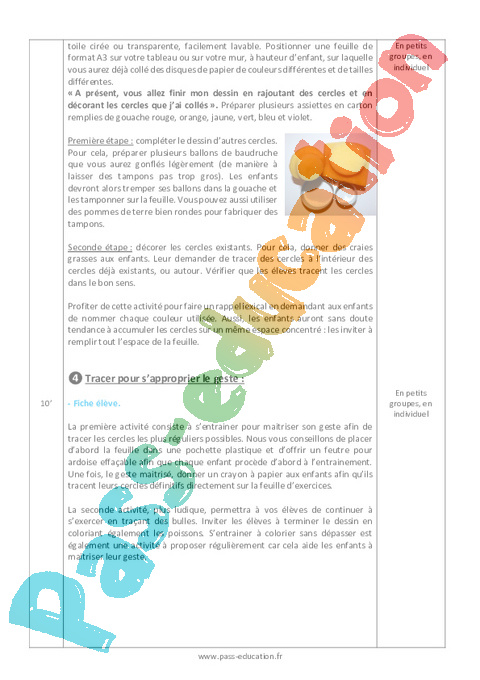 Matériel : Feuilles de format A3 avec des disques colorés de différentes tailles collés dessus ; gouache de différents couleurs ; ballons de baudruche ou pommes de terre (ou tampons) ; craies grasses ; fiche élève, pâte à modeler ; fiche écriture.