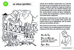Le vieux gardien en Primaire 2 – Lecture compréhension – Histoire illustrée – Niveau 2 Retrouvez une série de petits récits illustrés pour une lecture en autonomie avec leur questionnaire de compréhension. Lecture L’heure de la retraite a sonné pour Luc. Cela fait dix-sept ans qu’il est gardien du zoo de la ville. Il a nourri, soigné et nettoyé les cages de centaines d’animaux. C’est avec une grande tristesse que le vieux gardien fait le tour du parc une dernière…