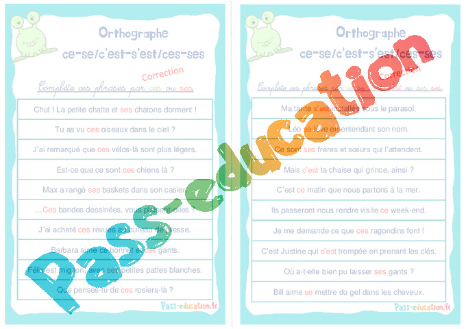 Homophones grammaticaux (ce-se c’est-s’est ces-ses) : Primaire 4, 5 – Rituels – Orthographe rtf