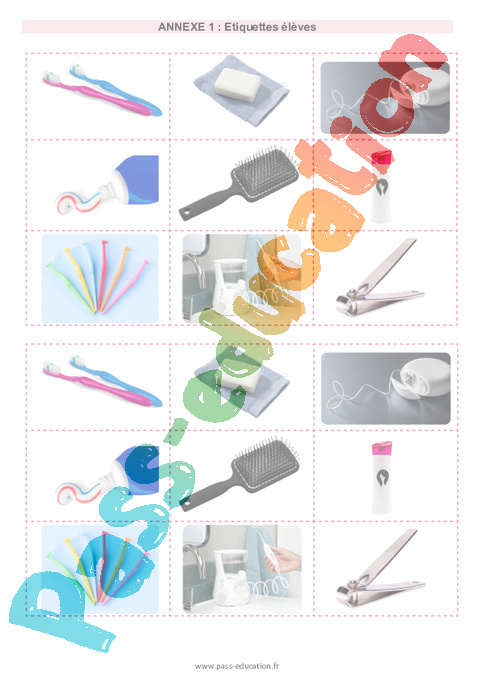 L’enseignant présente une à une les images en grand format qu’il accroche au fur et à mesure au tableau. Les photographies représentent différents accessoires assurant l’hygiène du corps et plus spécifiquement des dents. – « Par deux, vous allez maintenant trier ces images en deux groupes : imaginez que vous devez les répartir dans deux sacs différents. Réfléchissez bien à quelles images vous pouvez mettre ensemble. » L’enseignant fait référence aux deux colonnes tracées au tableau, avec les images aimantées au-dessous. Les élèves disposent des reproductions de ces photographies en petit format, et devront les disposer d’un côté ou de l’autre de leur table. L’enseignant passe dans les rangs pour aider, favoriser l’échange entre les deux élèves, si nécessaire. |