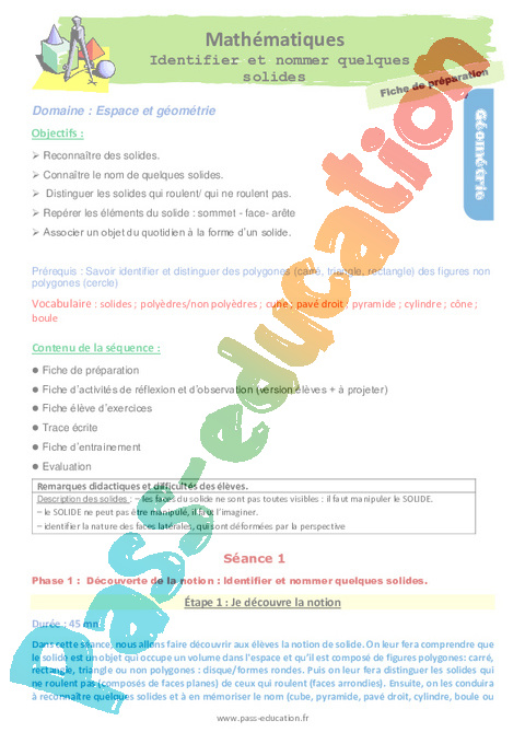 Présentation de la séquence : Primaire 2 Identifier et nommer quelques solides pdf