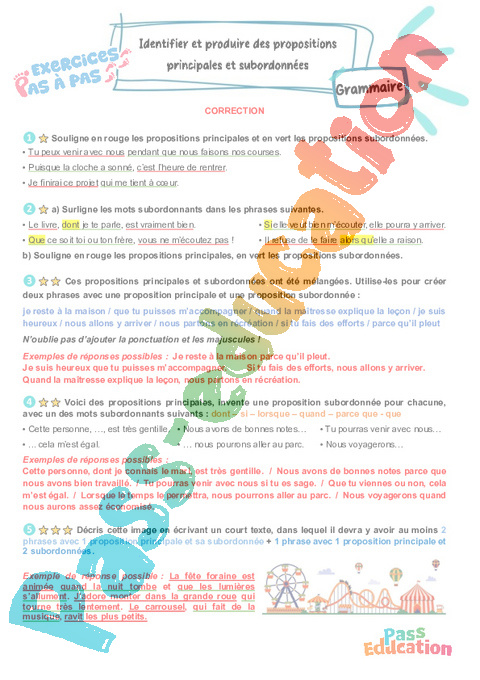 Exercices Pas à Pas avec mémo / leçon de grammaire pour travailler la compétence : Identifier et produire des propositions principales et subordonnées au : Primaire 5 .
