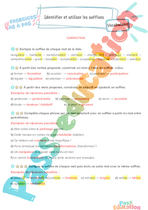 Correction Identifier et utiliser les suffixes : Primaire 5 – Exercices Pas à Pas pdf