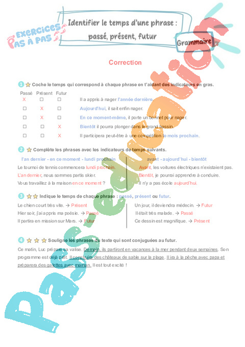 Exercices Pas à Pas avec mémo / leçon de conjugaison pour travailler la compétence : Identifier le temps d’une phrase : passé, présent, futur au : Primaire 3 .