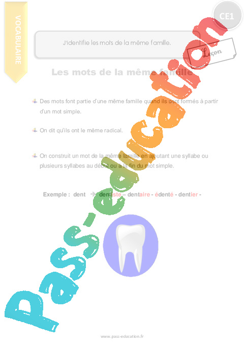Exemple : dent – dentiste – dentaire – édenté – dentier