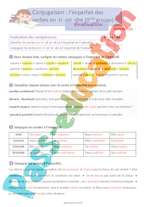 Correction Evaluation Imparfait des verbes en -ir, -oir et -dre (3e groupe) : Primaire 2 pdf
