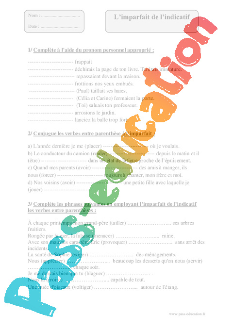 3/ Complète les phrases suivantes en employant l’imparfait de l’indicatif les verbes entre parenthèses :