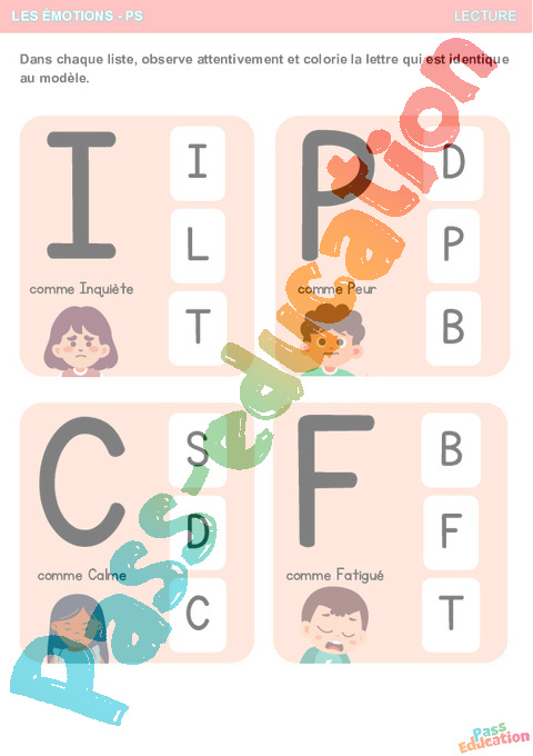 Inquiète, Peur, Calme et Fatigué – Les émotions – Lecture : Maternelle 1 – PDF à imprimer