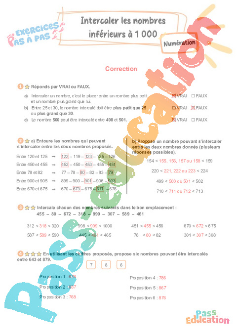 Correction Intercaler les nombres inférieurs à 1 000 : Primaire 3 – Exercices Pas à Pas rtf