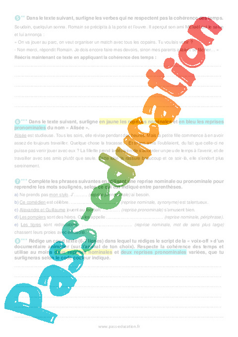Rédige un court texte (6-7 lignes) dans lequel tu rédiges le script de la « voix-off » d’un documentaire animalier (sur l’animal de ton choix). Respecte la cohérence des temps et utilise au moins deux reprises nominales et deux reprises pronominales variées, que tu surligneras selon le code couleur indiqué.