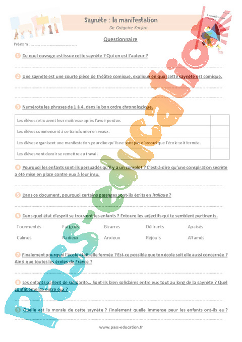 La manifestation (Saynète) de Grégoire Kocjan : Primaire 5 – Théâtre – Questionnaire + Correction pdf