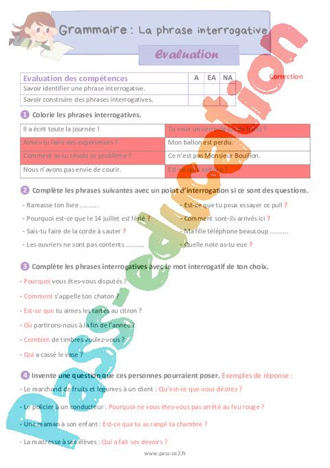 Evaluation Correction : Primaire 3 La phrase interrogative pdf