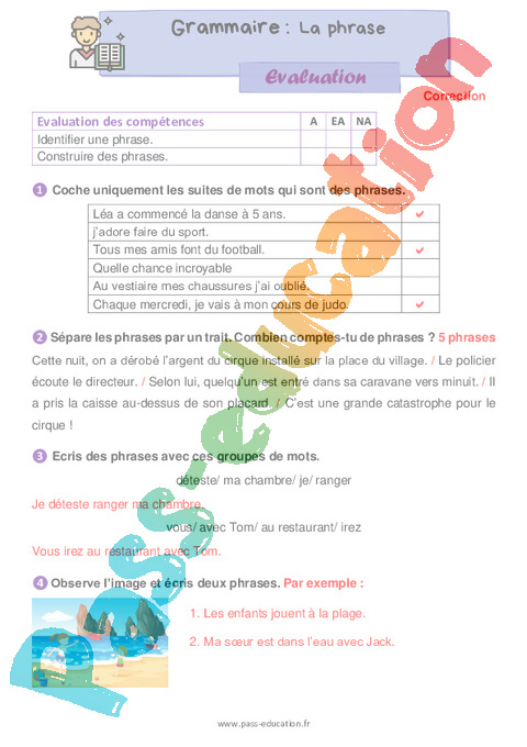Evaluation Correction : Primaire 2 La phrase pdf