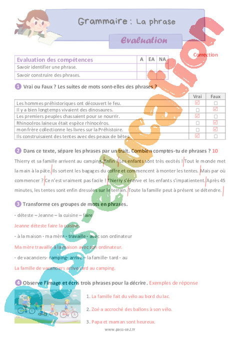 La phrase - Évaluation grammaire pour la Primaire 3 Correction pdf