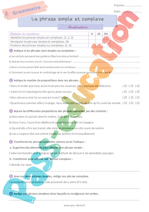 Evaluation La phrase simple et la phrase complexe 6ème pdf