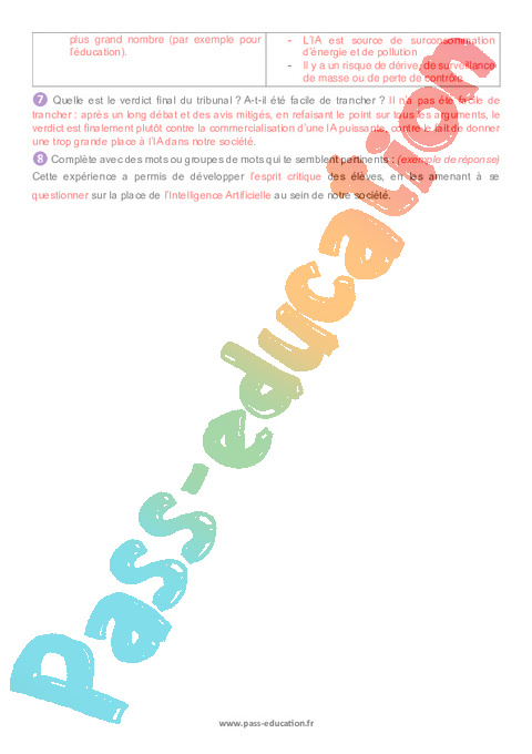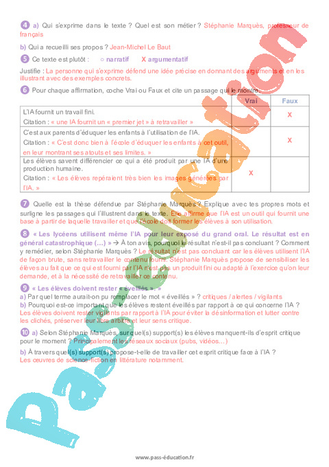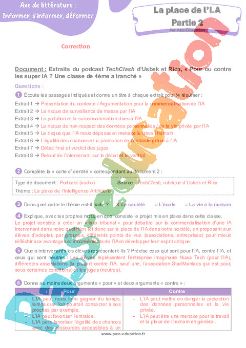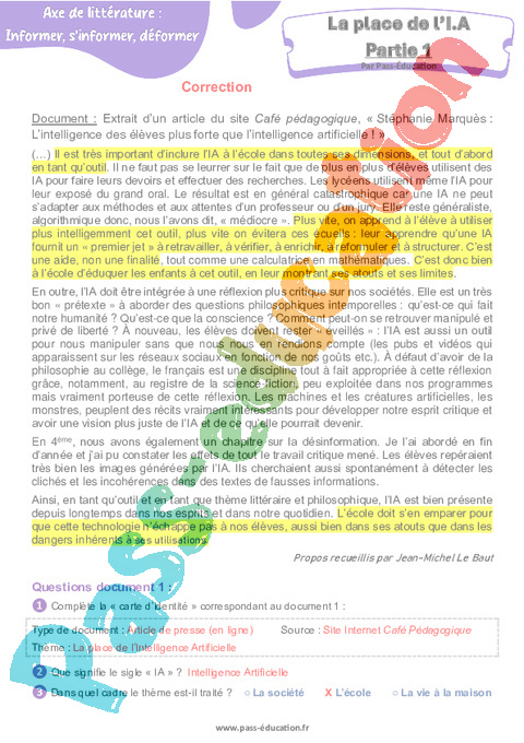 Correction Document de synthèse : Secondaire 2 La place de l’Intelligence Artificielle pdf