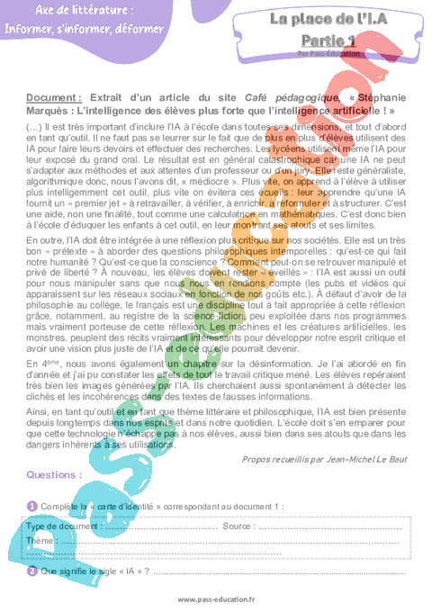 Littérature + Questionnaire : Secondaire 2 Partie 1 – La place de l’Intelligence Artificielle pdf