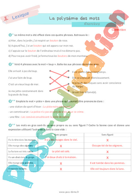 Correction La polysémie des mots – Exercices de vocabulaire pour la Primaire 6 pdf