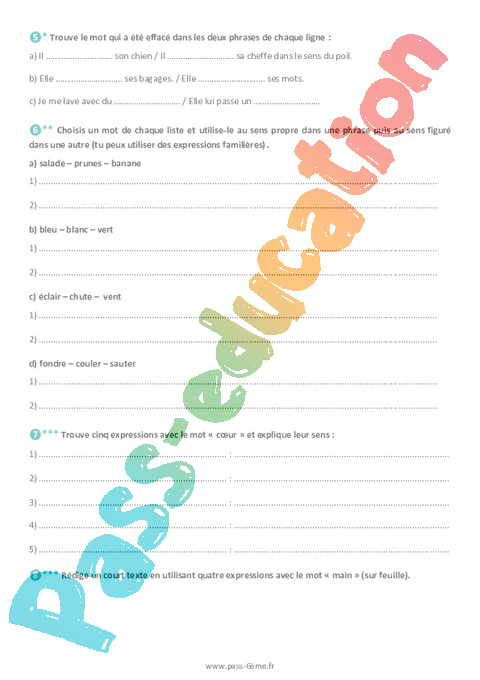 Choisis un mot de chaque liste et utilise-le au sens propre dans une phrase puis dans au sens figuré dans une autre (tu peux utiliser des expressions familières).