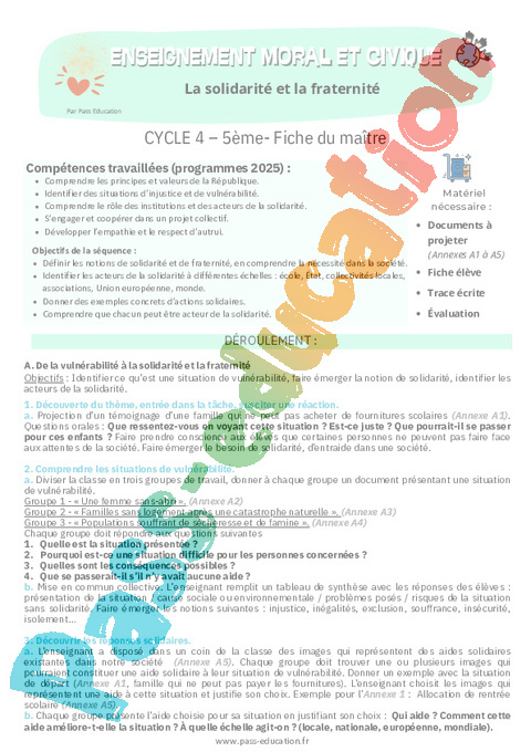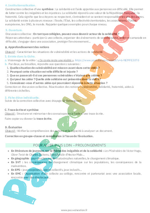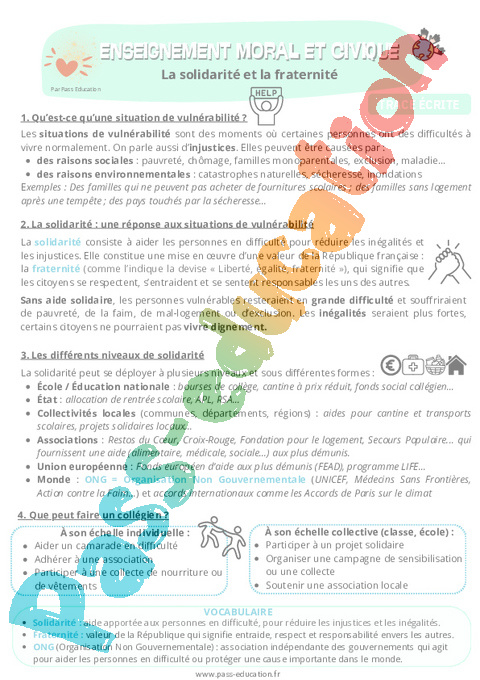Objectifs : Identifier ce qu’est une situation de vulnérabilité, faire émerger la notion de solidarité, identifier les acteurs de la solidarité.