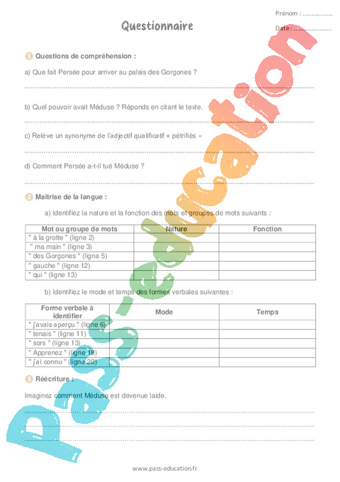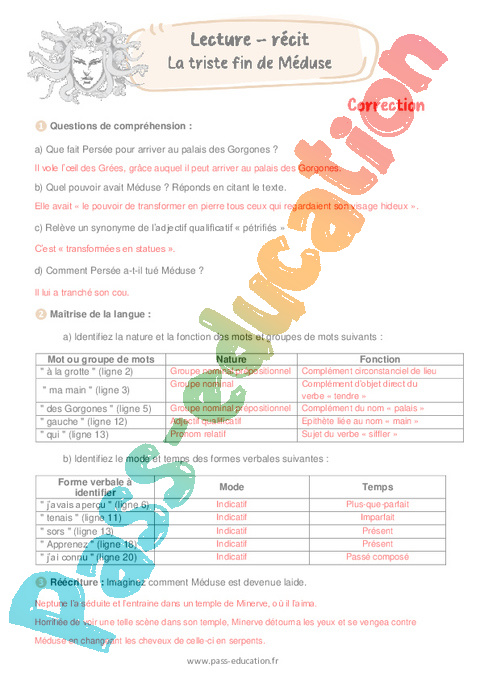 Les questions de compréhension tendent à vérifier la compréhension de certains passages, notamment en ce qui concerne le pouvoir de Méduse. L’exercice de langue de la fiche mobilise les connaissances de l’élève sur la nature et la fonction des mots dans la phrase. Enfin, un exercice d’écriture invite l’élève à imaginer comment Méduse est devenue laide.