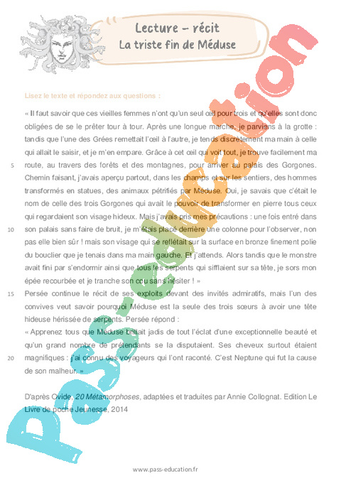Parmi les textes renvoyant à la mythologie, on trouve l’épisode de la triste fin de Méduse. Les élèves de Primaire 6 sont invités à lire ce passage extrait des Métamorphoses d’Ovide. Pour un accès plus facile à l’histoire, on propose une version adaptée au jeune public. Afin d’aider les élèves dans la lecture et la compréhension des textes, Pass-education a mis au point des fiches accessibles en téléchargement au format PDF.