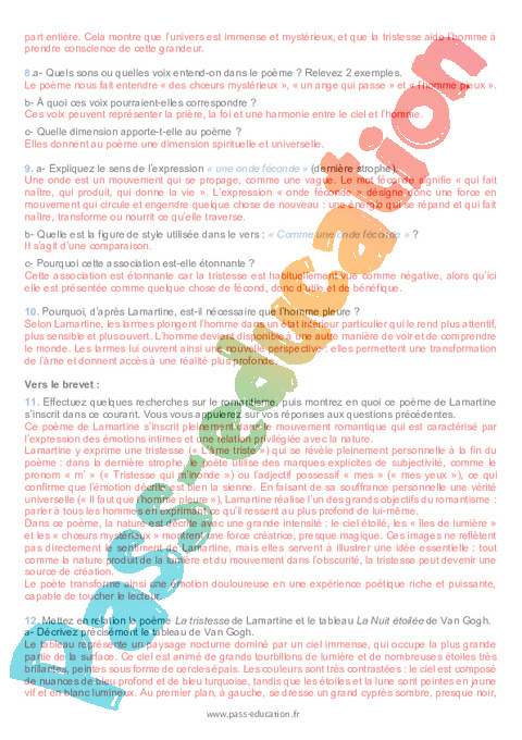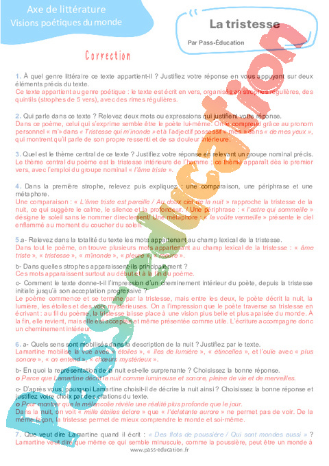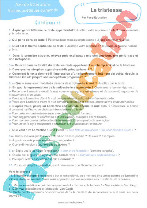 Correction Questionnaire La tristesse (Alphonse de Lamartine) : Secondaire 3 pdf