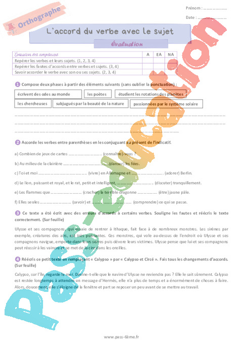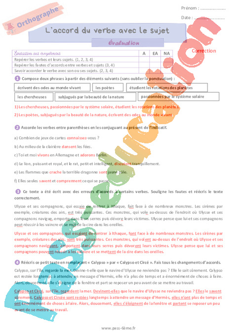 Correction Evaluation 6ème L’accord du verbe avec le sujet pdf
