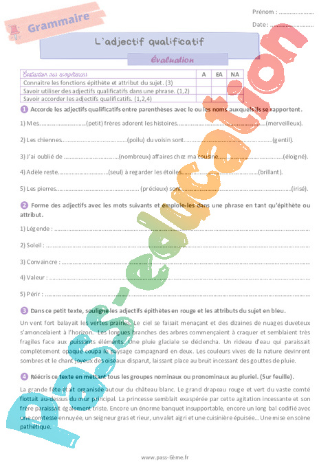 Évaluation de grammaire avec la correction sur l’adjectif qualificatif en 6ème.