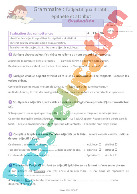 Correction Evaluation : Primaire 5 l’adjectif qualificatif épithète et attribut pdf