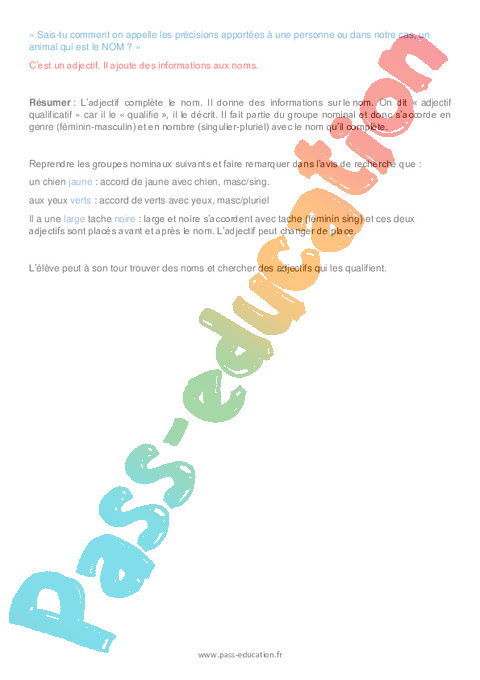 Résumer : L’adjectif complète le nom. Il donne des informations sur le nom. On dit « adjectif qualificatif » car il le « qualifie », il le décrit. Il fait partie du groupe nominal et donc s’accorde en genre (féminin-masculin) et en nombre (singulier-pluriel) avec le nom qu’il complète.