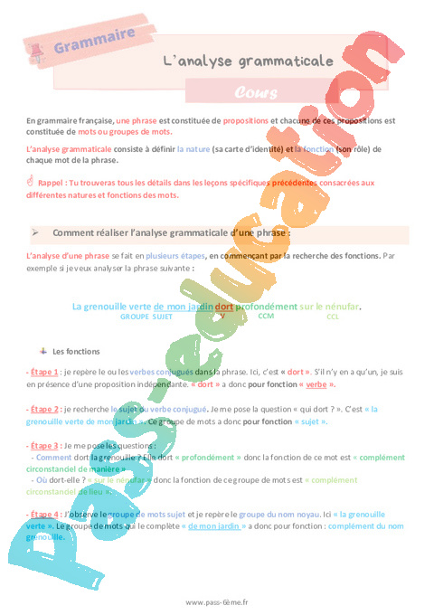 L’analyse grammaticale consiste à définir la nature (sa carte d’identité) et la fonction (son rôle) de chaque mot de la phrase.